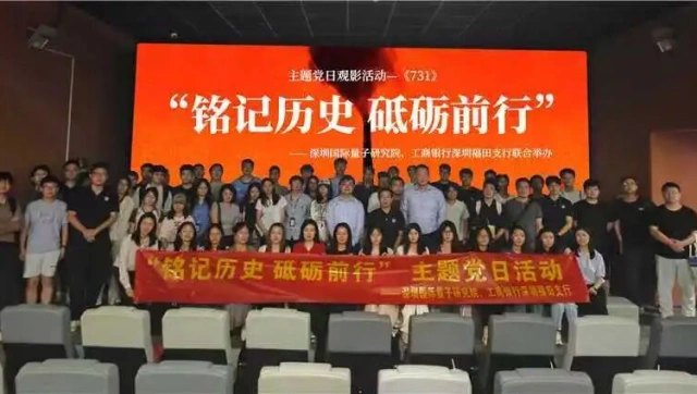 为纪念中国人民抗日战争暨世界反法西斯战争胜利80周年,缅怀先烈、铭记历史,9月18日,深圳国际量子研究院与中国工商银行深圳福田支行共同举办 “铭记历史,砥砺前行” 主题党日观影活动,组织80余名师生集体观看历史题材影片《731》,以影像为载体深化爱国主义教育。